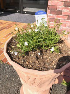 お店にある花壇の方は今年はあきらめました。去年にいろいろ花を植えてみたのですが、花壇の水はけが悪いのか西日が強いのがいけないのかわからないのですが、ことごとく枯れてしまって、生命力の強い葉系の植物だけが密集しています。とくに二つある花壇のうちの一つはアイビーで一杯です。・・・ほんとうに生命力強いですね。