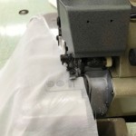 まず、メローロックミシンでトリムを縫い付ける本体生地の裾をほつれない様に縫います。ゆうあい縫製所ではメローロックで縫っていますが、縫製所によって普通のロックミシンでのロック縫いであったり、折り返して縫うことでほつれない様にしてあったりと様々ですが、要は生地を切りっぱなしにせずほつれない様にします。