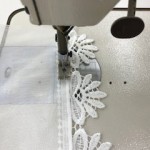 次にトリムやマクラメと本体生地とを合体させます。ほとんどのトリムには縫いわせるための直線状の刺繍部分があるので、裾柄刺繍部分に生地が出すぎ無い様な位置で本縫いミシンで縫っていきます。これでトリム取り付けが完了します。・・このようにトリム取り付けには必ず2回は縫う工程が必要になります。