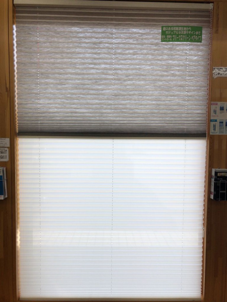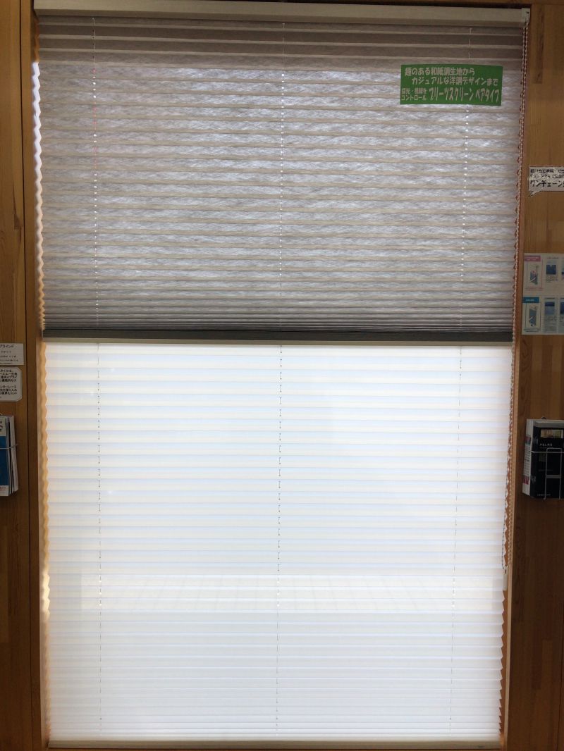 大判サンプルで展示しているTOSOさんのプリーツスクリーン「しおり」の「葉月」と「トリシア」です。