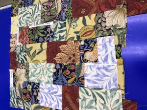 こんな感じに出来上がりました。これをあと3枚ほど作ってソファ生地に使います。モリスで有名な柄の生地が入っているので、このパッチワーク生地がモリスだとわかってもらえるとは思うのですが・・・高級生地コーナーに置いても遜色ないことを願います。