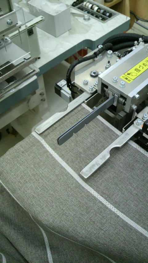 このミシンでの縫いが終わったらメジャーで製品巾に仕上がっているかどうか計ります。きちんとサイズ通りに仕上がっていたら、この機械での作業は終わります。オーダーカーテンの山の出来ばいは仕上がりに非常に影響します、山の形が悪かったりすると見た目に悪いので、やはり専門の機械で縫製すると綺麗ですね。