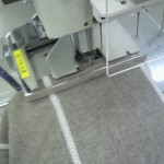 生地の巾・仕上がり巾・カーテンひだの種類・山の数・芯地巾などを入力をすると仕上がり巾になるように機械がセットされるので、生地を置いて一つ一つ山を縫っていきます。生地を手で張ってもっていなければならないので全て全自動というわけではありませんですが、格段に早く作れます。こんな変わったミシンですが、それでもミシンの下糸は本縫いミシンと変わらずボビンで糸を巻いて縫いますので、糸切れには注意しながら縫っていきます。