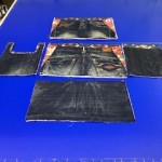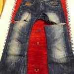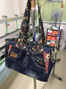 デニムを思いっきり裁断バッグのパーツに切り取って裏を付けました。