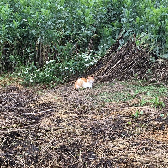 先日、商品の出荷作業を手伝っていたところ、シャッター前の草むらでねこちゃんを発見!