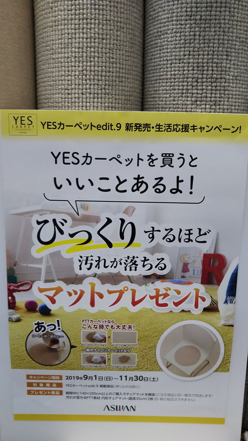 このPOPが目印です。YESカーペットの帯がまいてあるカーペットが対象になります。