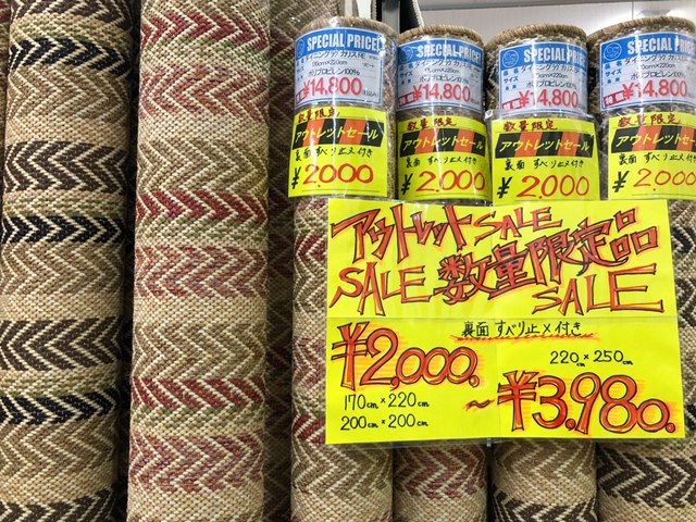 オーダーカーペット以外にも、お部屋の一部に気軽に敷いてお使いいただけるラグも取り揃えております。お財布も気軽に開けそうな価格のラグは枚数限定のものもありますのでどうぞお早めに!