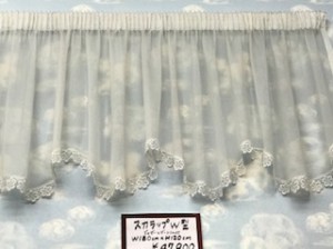 スカラップカーテンはスタイルカーテンでアーチ型やM型や今回作ったW型などあります。M型W型はアルファベットの形の様にカーテンの下部が曲線を描いてカットしてあるカーテンです。レース生地で作ってあり出窓などの窓につけることが多い形です。