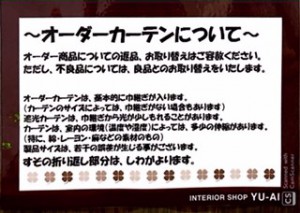 まず、ゆうあい店舗内にこのような文章が張ってありますので、来店された方は読んでみて下さい。書いてあるように基本的にオーダーカーテンは注文されたお客様の家のサイズに合うように作るので、注文をしてからのキャンセルや取り換えは不良品以外はお断りさせていただいております。なので注文の際にはサイズ・柄・色などしっかり確認してから注文をした方が良いです。