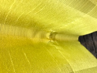 ↑こちらの写真の様なの状態です。ほとんどのオーダーカーテンの裾はこのように三折りにして縫って裾の始末をします。なので厚みが出来ているので、その状態でカーテンのヒダが付くとどうしても谷の部分の縫った部分にはしわがよってしまいます。・・・生地の質によってはそれが目立ちやすかったり、逆に目立ちにくかったりと差がありますが、このようなしわはあるものと思っていただいた方が良いと思います。どうしても気になる方は目立ちにくい生地を選んだり、掬い縫い縫製を指定して頂くと若干軽減されます。 カーテンを多く見ているとお店側の人間はこれがあるものと思ってしまっている部分があるので、カーテンのでここがあると嫌な部分は言って頂けたら、ある程度の縫製変更できる場合もありますので、店の者に相談して頂きたいです。