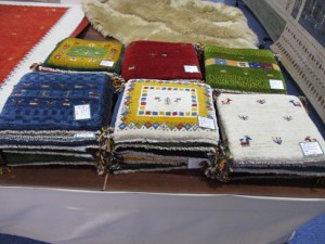 ウール繊維を青はインディゴ、黄色はザクロの皮などの天然の草木で染めた糸でつくられており、ウールの性質から夏でもむれにくく、冬には温かいという特徴を持っています。