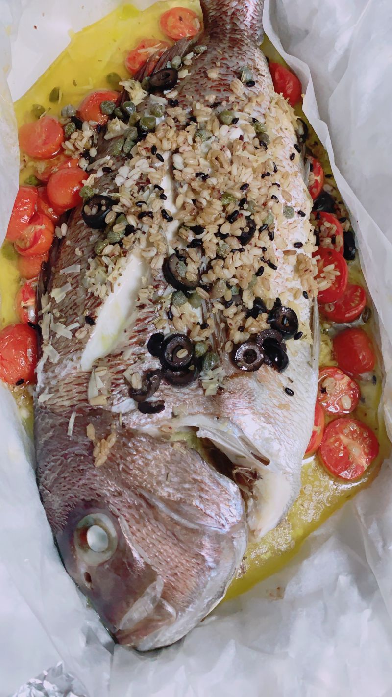 4.鯛を置いて、あとは順不同で、ニンニク、ミニトマト、ブラックオリーブ、ケッパー(瓶で売っています。)鯛の上に散らすようにバラまきます。