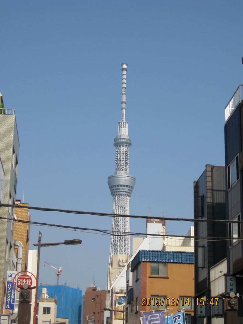皆さん、ご存知のスカイツリーです。まだ見に行っていなかったのですよね、なぜか、お盆休みの混雑している暑い最中に行って見て着ました。 写真は浅草の浅草寺から撮りました。