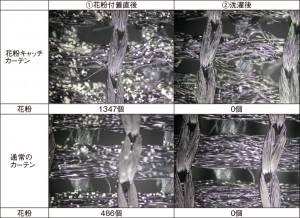 イメージ写真ですが、一般的なカーテンよりも多くの花粉をキャッチしてくれます。浮遊する花粉を付着させ、逃がしません。キャッチした花粉はご家庭の洗濯機で綺麗に除去できます。お洗濯しても繊維の構造そのものが花粉キャッチ効果を果たすので繰り返し機能を維持してくれます。