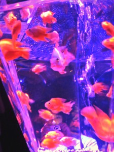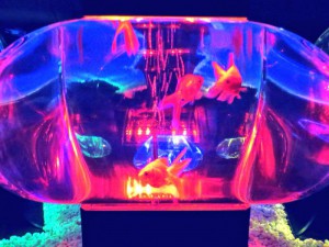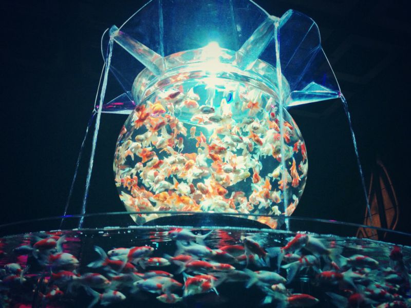 水槽の中で泳ぐ金魚がライトのあたり具合によって