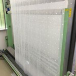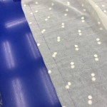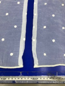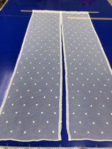 こちらが出来上がりになります。裾のウェイトロックを活かして作っています。通常の暖簾は上部の部分から作っていきます。今回の生地はウェイトロックでしたが、裾柄のレース生地で作っても良いと思います。