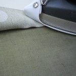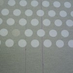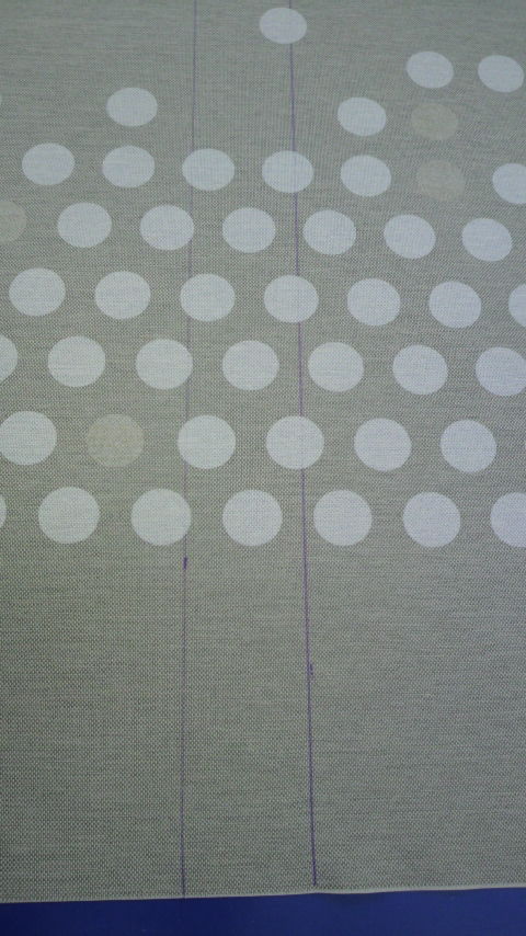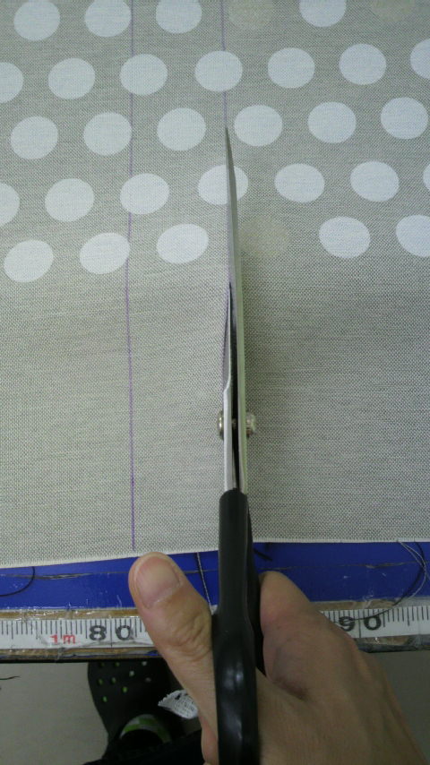 前回の続きになりますが、柄をきめたら生地の片側からチャコペンで線を引きぬいしろ分の線も引いてハサミで切ってからアイロンでチャコの線に沿ってアイロンをかけて線を付けます。その後、シェードの巾にもう片方にチャコペンで線をつけて、ぬいしろ分も線を引きハサミで切り同じくアイロンで線をつけます。