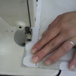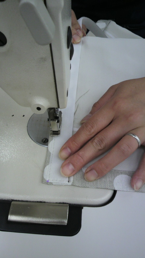 両耳を本縫いミシンで縫っていきます。(アイロンで折ってあるのでそのまま縫えます。)両耳を縫った後にきちんと生地が垂直に降りるように頭の部分を切り、縫い代分をアイロンを線をつけます。
