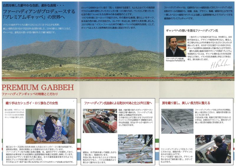 ギャッベはもともとイラン語で「荒い」と意味する言葉です。イラン南西部の遊牧民カシュガイ族やロリ族がベットをして使っていた厚さが5cmにもなる部厚い絨毯でした。現在はそのデザインが世界中に広まり日本などに輸出されています。