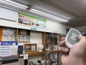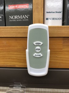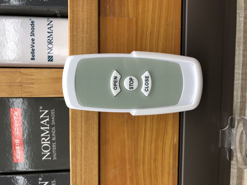 立川ブラインドの電動ロールスクリーン、弊店のサンプルのリモコンの受光部は右側ですが(左側に変更も可能との事)、写真のようにリモコンの先が受光部にあたってなくても操作可能です。