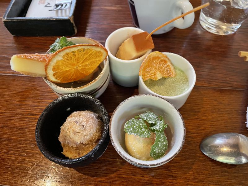 ちなみに左上からチーズケーキ、自家製プリン(揚げパスタが刺さってます)、抹茶のなにか(笑)、何味か忘れたアイス、ラムレーズンのアイスです。