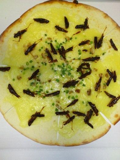 クリスピー生地にチーズがのったソースレスピザの上に、イナゴの佃煮がのっているんです。