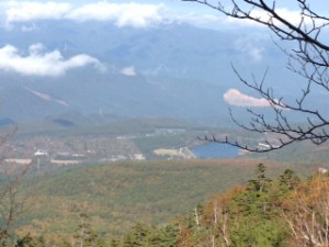 雲が下の方にあって、蓼科湖やその回りの樹木が小さく見えます。