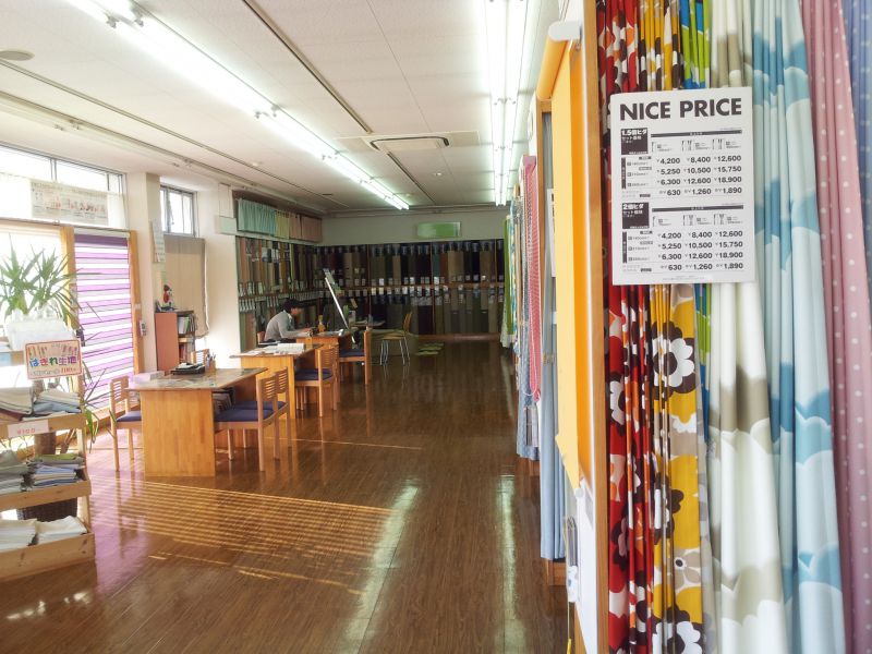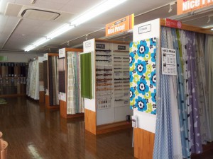 店内にはオーダーカーテンのサンプルが所狭しと吊してあり、国内メーカーの東リやサンゲツ、アスワン、シンコールを始め、輸入のカーテンや国産のジャガードの高級カーテンも数多く展示してあります。ウイリアムモリスのカーテンも展示してあります。