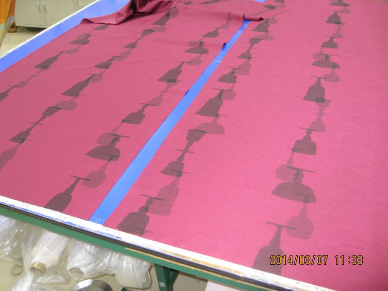 まず、生地を裁ちます。のれんはシェードのように真直ぐに布が見えるものなので、柄がある生地の時はうまく良い柄が出るように裁ちます。