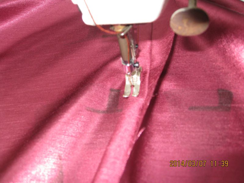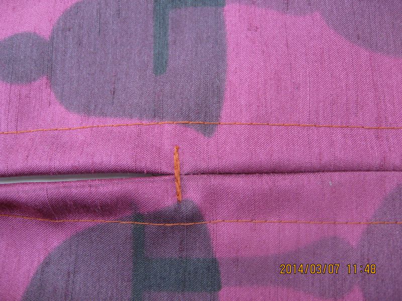のれんの分け目までを縫い繫ぎ開いて耳を縫っていきます。分け目部分は縫い目が裂けていかないように横に止め縫いをしておきます。両耳を縫い、ポール通し部分を袋縫いをしたら、