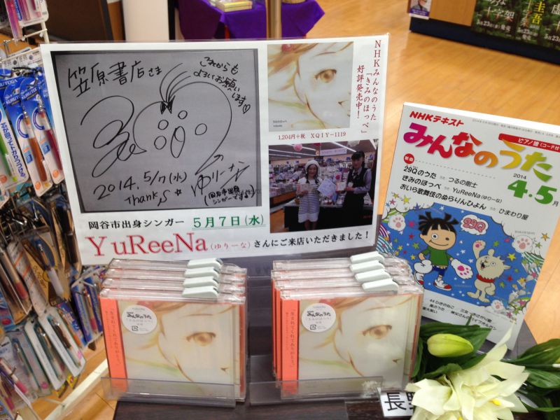 「きみのほっぺ」が現在「NHK みんなのうた」で放映中ですが、CDも発売されております。 岡谷市の笠原書店では写真のような特設コーナーを作って頂きました。 また、アマゾンなどの通販や、タワーレコードなどでも販売しております。