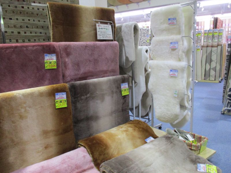 インテリアショップゆうあい諏訪店には、ムートンやムートンシーツなど暖かい商品がずらり並んでおります。