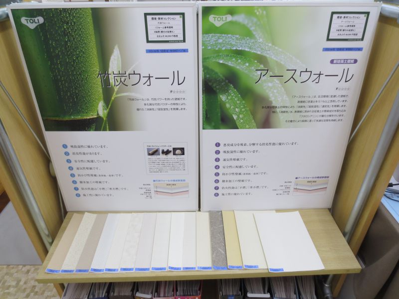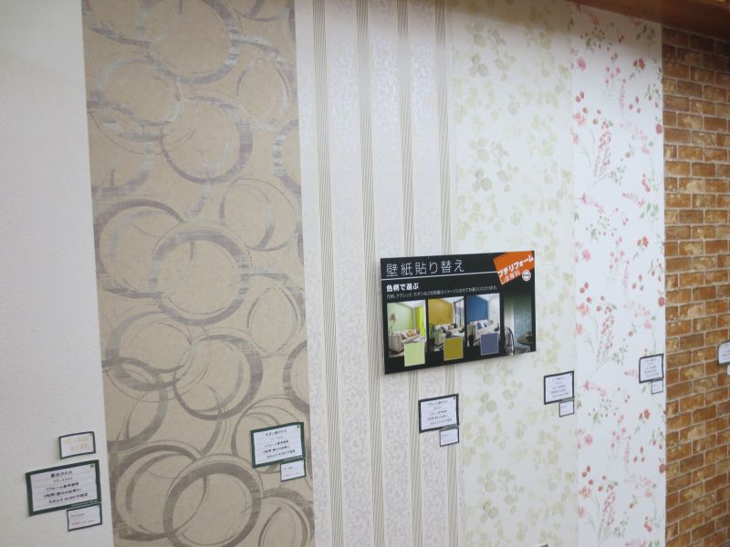 インテリア商品としてカーペット・ラグ・玄関マット・カーテン類やブラインド・ロールスクリーン等の取り扱いが多いのですが、壁紙(クロス)の張替も多く施工させて頂いております